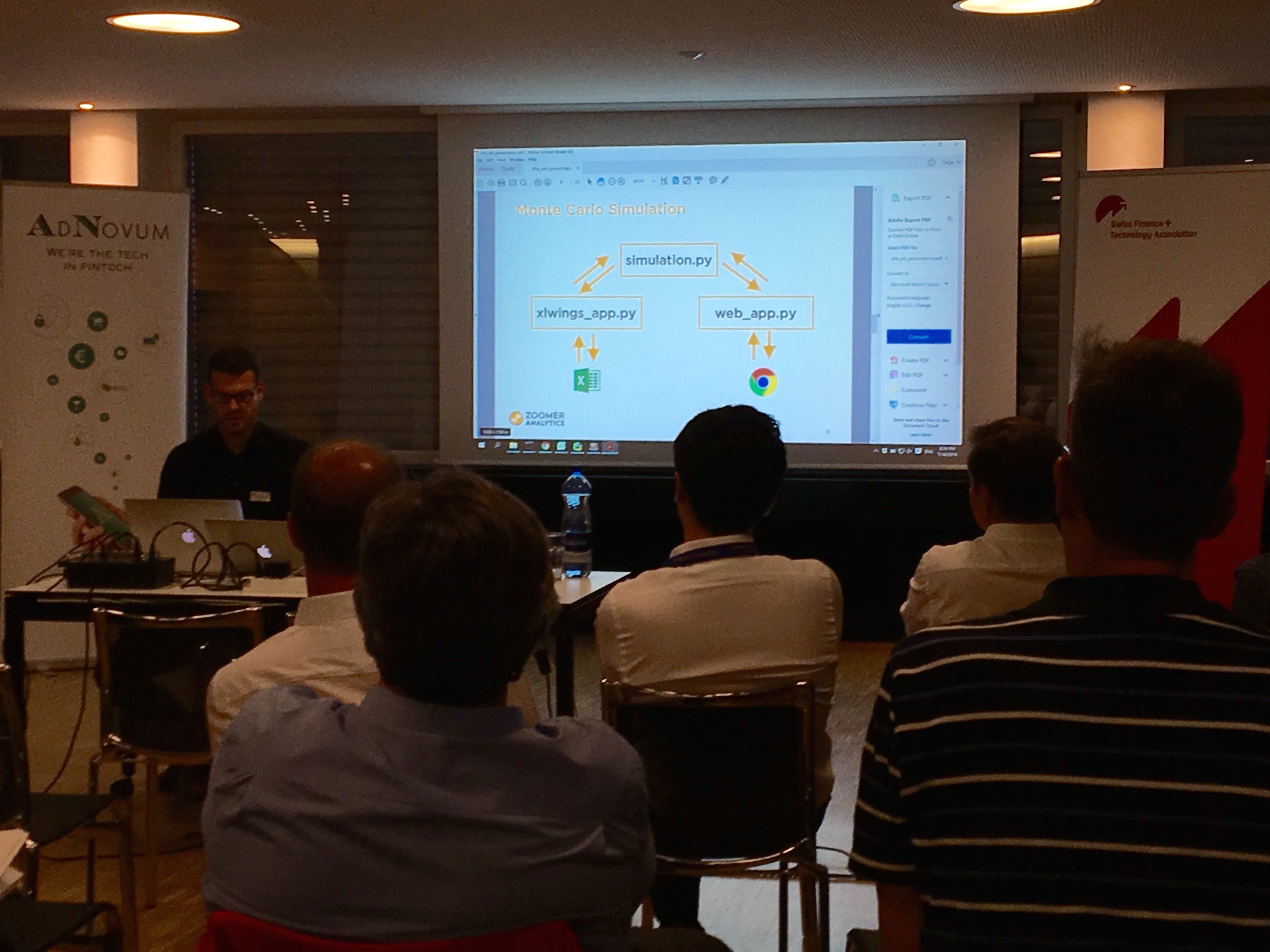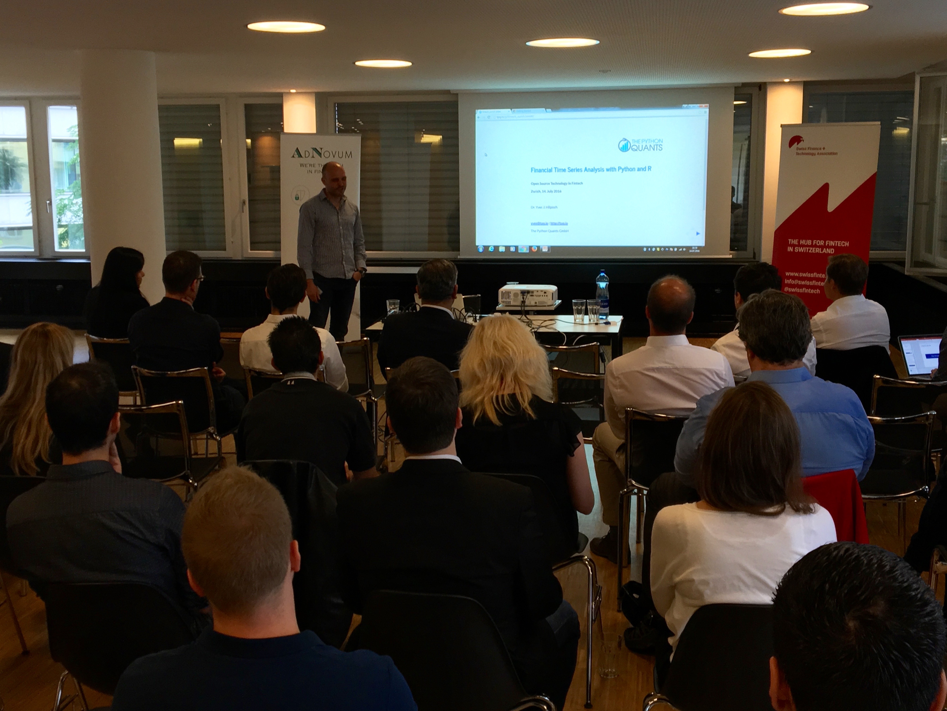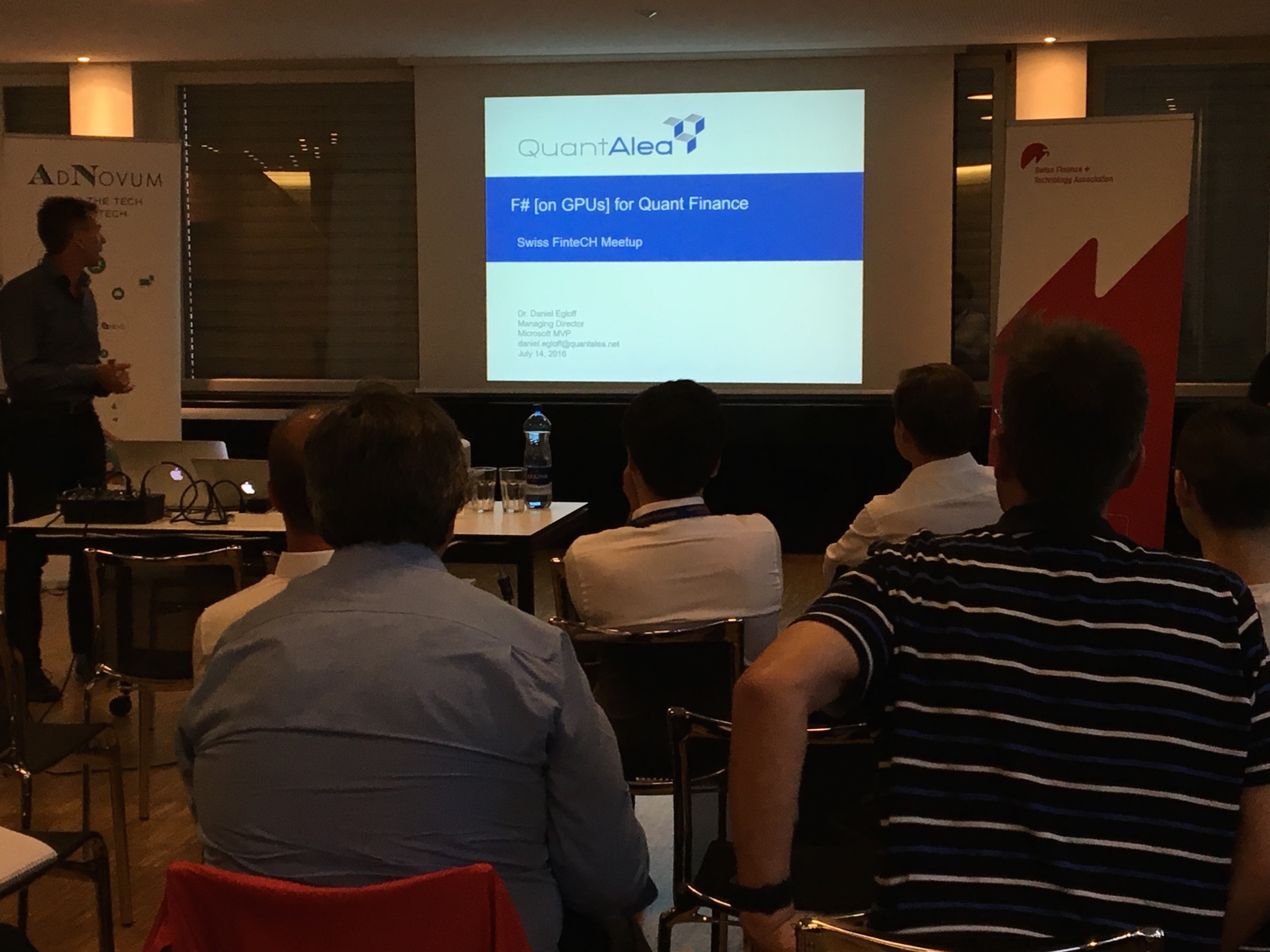 With a solid attendance of over 40 participants from diverse backgrounds, as is often the case in Zurich, the talks provided much needed practical examples of leveraging the latest advancements in Python, R, F# and GPUs to solve complex problems. The speakers for the evening, who are well known experts in their field, stayed back late after the talks to answer questions and participate in FinTech discussions with the audience.