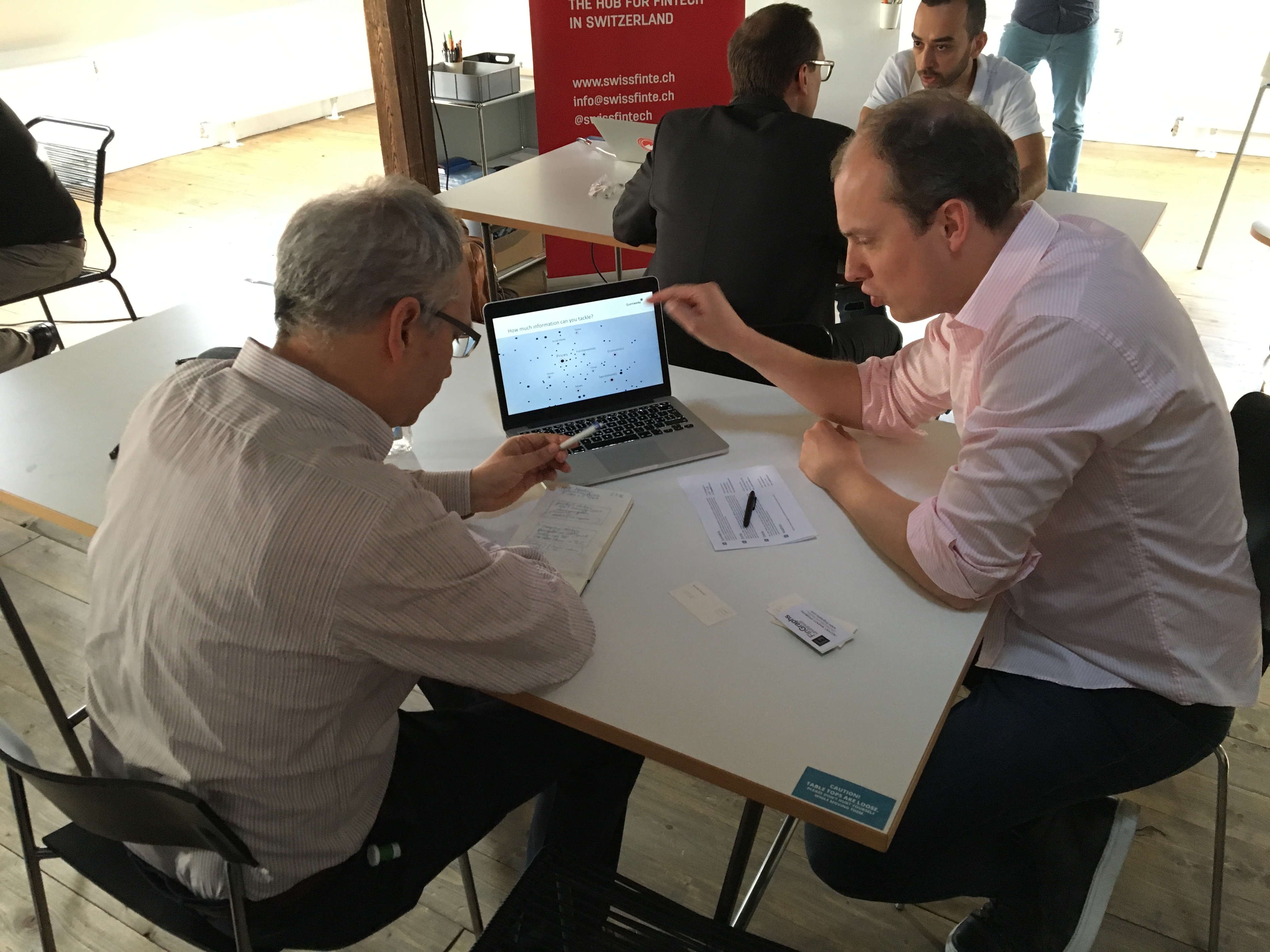 After a short introduction from the president of the Swiss FinTech Association, John Hucker, the speed dating between mentors and mentees began. Startups had 7 minutes to introduce their concept and venture to the mentors seated around their table. A quick speech and several questions allowed for a first impression and enabled to see whether there is space for future collaboration. The procedure was then repeated with the groups of mentors rotating from one table to another waiting to discover all ideas. This format allowed for plenty of lively conversations to take place in less than 2 hours of overall meeting time. Most importantly it gave the participants a chance to evaluate with whom they would like to work with throughout the program.